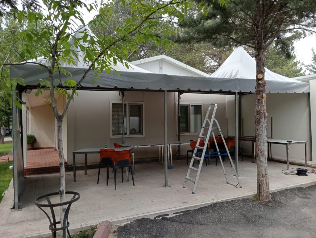 Üretilen çadırlar, profesyonel ekipler tarafından kuruluma hazırlanır. Montaj aşamasında: